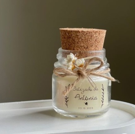 Mini velas super perfumadas, com fechamento em rolha, feitas com cera de coco e aromatizadas com o aroma que vc escolher. Decoradas com flores, e tria de mico e adesivo personalizado.
